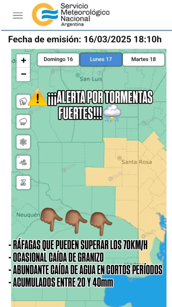El Servicio Meteorológico Nacional (SMN) ha emitido una alerta amarilla para la tarde y noche del lunes, advirtiendo sobre la llegada de tormentas aisladas, algunas de ellas localmente fuertes. La alerta, que abarca una amplia zona, prevé la posibilidad de ráfagas de viento que podrían superar los 70 km/h, caída de granizo ocasional y abundante caída de agua en cortos períodos.