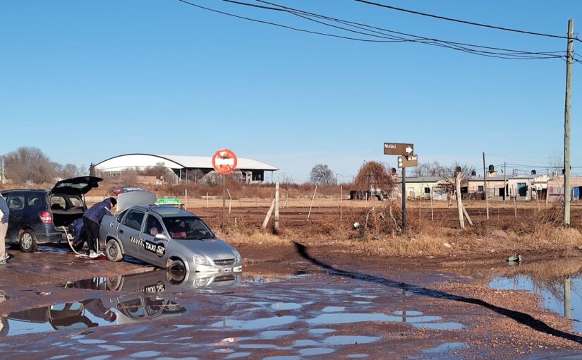 Santa Rosa, La Pampa – Un insólito incidente vial se registró esta mañana, 11 de julio, en la esquina de las calles Maipú y Duval, donde un taxi quedó atrapado en un cráter de considerables dimensiones. Vecinos de la zona acudieron en ayuda del chofer para intentar sacar el vehículo del bache.